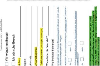 zur Gewährleistung und zum Schutz personenbezogenen Daten veröffentlicht die Gemeinde Hünfelden die wöchentlichen Auskünfte zu Ehe- und Altersjubiläen (ab dem 80sten Geburtstag alle 5 Jahre oder 50.-, 60.-, 65.-,70.-Ehejubiläen) im Mitteilungsblatt nicht mehr. Jeder, der eine Veröffentlichung und /oder eine Gratulation durch Vertreter der Gemeinde Hünfelden wünscht, kann dies durch Abgabe des ebenfalls im MTB veröffentlichten Fragenbogens – vier Wochen vor dem Jubiläumsdatum - bei der Gemeindeverwaltung, im Bürgerbüro vormerken lassen. Ohne persönliche Einwilligung können keine personenbezogenen Daten mehr veröffentlicht werden!