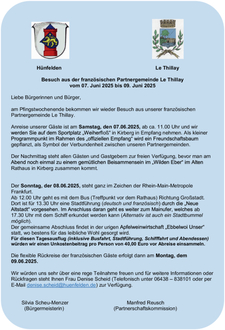 Anreise unserer Gäste ist am Samstag, den 07.06.2025, ab ca. 11.00 Uhr und wir werden Sie auf dem Sportplatz „Weiherfloß“ in Kirberg in Empfang nehmen. Als kleiner Programmpunkt im Rahmen des „offiziellen Empfang“ wird ein Freundschaftsbaum gepflanzt, als Symbol der Verbundenheit zwischen unseren Partnergemeinden.