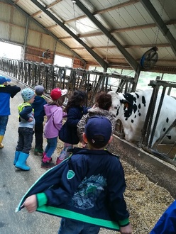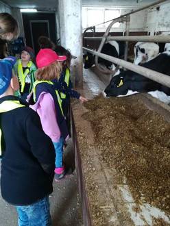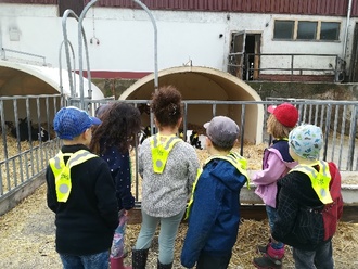 Dort angekommen, begrüßte uns die Schwiegertochter des Hauses Lana Litzinger mit ihrer Tochter Anni ganz herzlich und erklärte uns, was wir zu beachten haben und wie wir uns verhalten sollen. Die Kinder zogen ihre Gummistiefel an und die Führung über den Hof konnte beginnen. Lana erklärte uns sehr spannend was der Hof des Familienbetriebes zu bieten hat. Die Kinder hatten viel Spaß bei den kleinen Kälbchen und waren sehr erstaunt über die ausgewachsenen Kühe. Einige konnte man sogar anfassen und streicheln. Wir lernten viel über die Zucht des Lindenhofs, über Milchproduktion, über die Energieerzeugung, über die Umwelt und den Ackerbau.