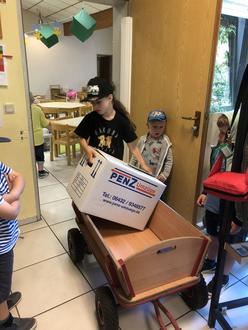 Vorher wurden schon fleißig Kisten gepackt, wovon einige von den Kindern mit dem Bollerwagen zur Hintergasse transportiert wurden.