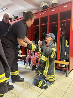 Die Kinder schauten sich das Feuerwehrhaus an, bestaunten die Feuerwehr- Schutzausrüstung, bestaunten die Geräte im Feuerwehrauto, freuten sich über das Blaulicht und übten sich im Feuerlöschen.