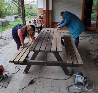 Nun sehen unsere Sitzgruppen dank der tollen Eltern/Kind Initiative fast wie neu aus. Danke für den tollen und auch lustigen Einsatz!