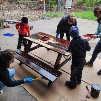 Fleißige Kinder und Eltern rückten mit Schleifmaschine, Pinsel, Rollen und Farbe an. „Heute große Streichaktion in der Kita Heringen!“ Die Sitzgruppen hatten mal wieder einen Anstrich nötig und es haben sich ganz viele dafür Zeit genommen. Los gings,…. Mit vollem Tatendrang machten sich alle ans Werk. Schleifen, säubern, streichen, warten,….. warten…… noch mal streichen.