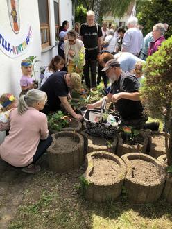 Dann konnten nach langer Zeit wieder die Pflanzsteine vor der Kita bunt bepflanzt werden. Durch die Auslagerung der Kita in die Waldschänke, für die Dauer der Umbau- und Renovierungsarbeiten, waren sie ziemlich zugewuchert und mussten erstmal freigeräumt und mit Erde neu aufgefüllt werden.