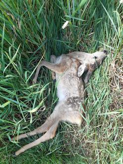 Hier zu sehen ist ein ca. 3 - 4 Wochen altes, kerngesundes Rehkitz, was durch einen Hundebiss getötet wurde. Die Bissspuren waren eindeutig zu erkennen.