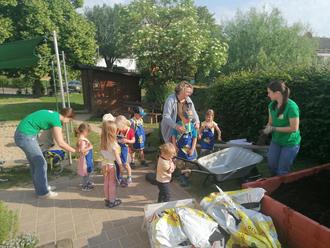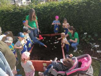 Die Kinder wurden mit Gartenschürzen ausgerüstet und halfen mit den Erzieherinnen kräftig mit. Im Nu war das Beet fertig und es konnte gemeinsam mit den Kindern Kohlrabi, Radieschen, verschiedenen Salaten bepflanzt werden. Die gestifteten Kindergießkannen wurden mit Wasser befüllt und alle Pflanzen wurden gut gegossen.