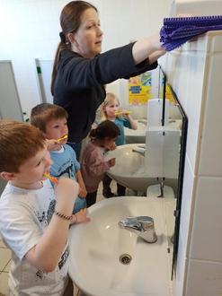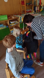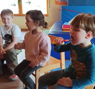 Huch, wer besucht uns denn da? Ist das etwa die Hexe Irma? Und sie hat auch noch jemanden mitgebracht! Frau Dr. Hinrichs unsere Patenzahnärztin und Ihre Zahnarzthelferinnen. Sie haben uns allen ganz viele spannende Informationen über gesunde Zähne und wie sie es bleiben gegeben. Dann hat jedes Kind eine Zahnbürste geschenkt bekommen und durfte mit Begleitung eines Zahnputzliedes die Zähne putzen.