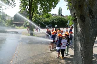 Das Beste kommt zum Schluss, als die Kinder selbst zu Feuerwehrleuten werden. Ausgerüstet mit Jugendfeuerwehrhelmen und den Handschuhen der Kinderfeuerwehr dürfen sie mit kleinen D-Strahlrohren arbeiten. Da werden fleißig die Bäume gegossen, ein vorbeifahrendes Auto „gewaschen“ und natürlich bleiben nicht alle Kinder trocken dabei.