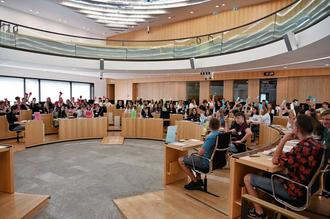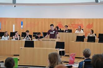 Nichts desto trotz: auch der Spaß kam bei alldem nicht zu kurz. Bei den Reden am Original-Rednerpult des Landtags offenbarte sich das ein oder andere Talent. Eine Reihe von Reden endeten mit lustigen Pointen und dem entsprechenden Applaus aller Mitschülerinnen und Mitschüler – fraktionsübergreifend und unter dem Beifall der anwesenden Lehrerinnen und Lehrer, in diesem Falle ohne direkten politischen Bezug, um so mehr aufgrund der Originalität der Beiträge.