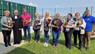Im Anschluss an den Gottesdienst entstand dies Gruppenbild mit (v.l.n.r.) Bürgermeisterin Silvia Scheu-Menzer, Dekan Johannes Jochemczyk, den Mitgliedern des Verkündigungsteams Christian Hundt, Wolfgang Plodek, Tanja Konter, Sarah-Marie Fröhlich, Ursula Bornemann und Ulrich Finger sowie dem Vorsitzenden der Modellfluggruppe Stefan Ebener