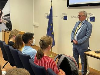 Im anschließenden Informationsgespräch diskutierte er mit den Schülerinnen und Schülern über aktuelle Themen wie den Ukraine-Konflikt oder den Klimaschutz. Außerdem setzen sie sich mit den Entscheidungsprozessen der europäischen Institutionen auseinander.
