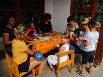 Dann ging es zum gemütlichen Teil bei Kaffee und Kuchen über. Die Kinder beschäftigen sich unterdessen bei den verschiedenen Spielstationen rund um das Thema „Wasser“ und konnten sich beim Spielen und Matschen an unserer Wasserbahn abkühlen.