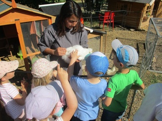 Ganz aufgeregt teilten wir uns danach in 2 Gruppen auf, um abwechselnd den Hof zu erleben. Fr.Müller hatte verschiedene Schüsseln mit Essen für die Tiere vorbereitet. Es gab Obst, Gemüse, Haferflocken, Mehlwürmer und vieles mehr. Gemeinsam überlegten wir, welches Futter welche Tiere bekommen. Welch eine Freude war es für die Kinder dann Enten, Hühner, Hasen, Pferde, Kaninchen und Kühe zu füttern. Im Kleintiergehege war es sogar möglich ein Huhn und ein Hase zu streicheln.