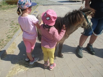 Bei einem Rundgang über den Hof durften die Kinder in den Stall, die Pferdeweide mit den Ponys anschauen und auf dem Trainingsplatz wie ein Pferd laufen und über Hindernisse springen.