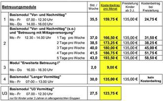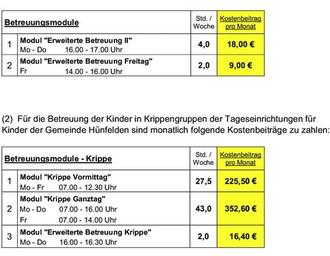 (1) Für die Betreuung der Kinder in Kindergartengruppen oder altersübergreifenden Gruppen der Tageseinrichtungen für Kinder der Gemeinde Hünfelden sind monatlich folgende Kostenbeiträge zu zahlen: a) Kindertagesstätten Kirberg, Heringen, Nauheim, Neesbach und Ohren