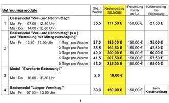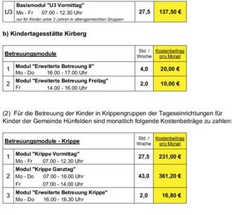 (1) Für die Betreuung der Kinder in Kindergartengruppen oder altersübergreifenden Gruppen der Tageseinrichtungen für Kinder der Gemeinde Hünfelden sind monatlich folgende Kostenbeiträge zu zahlen: