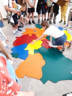 Ausgestattet mit Forscherheft, Klemmbrett und Stift ging es direkt an die erste von insgesamt sieben interessanten Stationen. Dabei wurden die Bundesländer als Riesen-Holzpuzzle gelegt, der altehrwürdige Musiksaal bewundert, Kreuzworträtsel gelöst, Prioritätenkisten gestapelt und vieles mehr. Am beeindruckendsten war sicherliche der Plenarsaal, wo „in echt“ die hessischen Gesetze beschlossen werden.