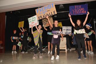 Zweimal alle Plätze besetzt, zweimal Aufregung vor der Aufführung bei den jungen Darstellerinnen und Darstellern und große Freude über den begeisterten Applaus nach der Aufführung: Nach einer Idee von Eva und Monica Grund führten die Klassen 5Ga und 5Gb unter Anleitung der Lehrkräfte Michelle Meuser und Manfrend Klenovsky das Musical "Es war einmal oder so..." auf. In der ersten Aufführung am Morgen waren die Schülerinnen und Schüler der 5Ga als Schauspieler und Schauspielerinnen auf der Bühne zu sehen, die der 5Gb sangen im Chor. Bei der Abendaufführung in der Aula der Freiherr-vom-Stein-Schule wechselten die Rollen.