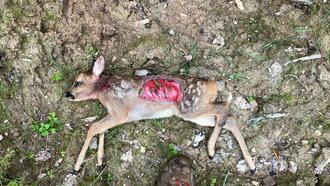 dieses Bild wurde uns aus Kirberg zugesandt. Das Rehkitz musste auf Grund der schweren Verletzungen erlegt werden. Es handelt sich um eine offensichtliche Biss- bzw. Risswunde eines Hundes.