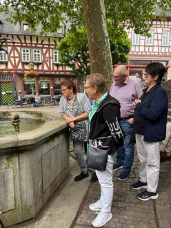 Unsere Stadtführerin Gaby begrüßte uns auf dem König-Adolf-Platz, dem historischen Zentrum der Altstadt. Gleich zu Beginn beeindruckte uns der Löwenbrunnen, gekrönt von einem goldenen Löwen – dem Wappentier Nassaus.