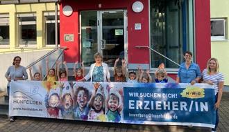 Seit Neuestem wirbt die Gemeinde Hünfelden auch mit einem öffentlichen Banner über die B417 um neues Erzieherpersonal. Die Gemeinde unterhält selbst fünf Kitas mit rund 280 Kindern. Diese werden von aktuell 65 Fachkräften in Voll- und in Teilzeit betreut. "Wir müssen neue Wege gehen. Durch Hünfelden fahren täglich viele Menschen aus der Region“, sagt Bürgermeisterin Silvia Scheu-Menzer. „Sie sind mit dem Auto unterwegs, z.B. auf dem Weg nach Wiesbaden, da kommt man an dem Banner vorbei.“