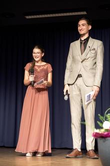 Da diese Generation auch vor zahllosen Herausforderungen steht, wünschte die Schulleiterin allen, dass sie couragiert und optimistisch bleiben und dankte den Eltern, die ihre Kinder begleitet und unterstützt haben und den Lehrerinnen und Lehrern, die ihren Teil dazu beigetragen haben, dass die Schülerinnen und Schüler Bildung, Haltung und Werte entwickeln konnten. Emotionaler Höhepunkt der Rede war das Verlesen der Punkte, für die die Schülerinnen und Schüler ihre Dankbarkeit zum Ausdruck bringen wollten. Sie dankten unter anderem für Freundschaften, Klassenfahrten, das Erlernen von Sprachen und letztlich für all das, was die Schule ihnen ermöglich hat. Gänsehautfeeling stellte sich mit dem Gesang von Mary-Jane Temin aus der Klasse 8H ein. Professionell trug sie das Lied „A million dreams“ von Benj Pasek und Justin Paul vor und konnte sich über riesigen Applaus freuen. Der stellvertretenden Schulsprecher Niklas Krämer schilderte in einer humorvollen Ansprache die Sicht der Schüler auf die vergangenen Schuljahre am Freitag. Bei der Abschlussfeier am Samstag sprachen das Schulsprecherinnen-Team Nelly Helfenstein und Nele Roth zu den Gästen über ihren Rückblick auf die vergangenen Schuljahre, bevor es mit einer Tanzeinlage weiterging. Lia Möhlhenrich und Emilia Rauch brachten am Freitag einen Tanz zur Musik von Abba auf die Bühne, am Samstag begeisterten Clara Buchner und Greta Armgat das Publikum. Viel zu lachen gab es in der Spielszene „Mikrokosmos Lehrerzimmer“, in der der Kurs „Darstellendes Spiel“ der Klasse 8Ga unter Leitung von Patricia Birkenfeld einige Lehrkräfte auf die Schippe nahm, was zu regelrechten Lachsalven führte. Nach den Grußworten und Glückwünschen der Bürgermeisterin Scheu-Menzer, sich in einer persönlichen Rede an die Absolventinnen und Absolventen wandte bzw. der Landtagsabgeordneten Frau Schardt-Sauer, dem Ersten Beigeordneten Herrn Krebs sowie dem Schulelternbeirat Herrn Haffert und der Vorsitzenden des Fördervereins Frau Romeleitis standen die Abschlussklassen selbst auf der Bühne. Am Freitag trug die Klasse 10Rb das Gedicht „Das Leben“ von Mutter Theresa mit verteilten Rollen vor. Am Samstag sang die Klasse 10Rc das Lied „If we ruled the school“. Dann kam der Höhepunkt des Abends: Die Verleihung der Zeugnisse. Schulleiterin und Klassenlehrer bzw. -lehrerin beglückwünschten alle Abgänger zu ihren Abschlüssen. Auch in diesem Jahr schloss sich die Ehrung der Jahrgangsbesten der Schülerinnen und Schüler an die sich besonders engagiert hatten. Jahrgangsbeste sind David Hofmann (9H) mit der Note 1,75, in der Realschule Leoni Weiler (10Ra) mit der Note 1,4 und im Gymnasialzweig Bennet Loth (10Gb) mit dem traumhaften Ergebnis von 1,25. Außerdem wurden zahlreiche Schülerinnen und Schüler mit einem Geschenk des Fördervereins geehrt, die sich als Ersthelfer betätig hatten, als Schülermediatoren ausgebildet waren, den Erstklässlern als Buslotsen geholfen hatten, beim Schulradio engagiert waren oder durchgehend am Bilingualen Unterricht teilgenommen hatten bzw. die Interessen der Schülerschaft vertreten hatten.