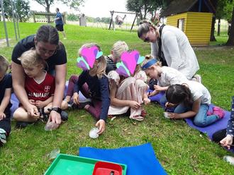 Nach einem kurzen, aber herzlichen Programm der Kinder konnten sich alle Besucher bei Kaffee und Kuchen entspannen und das schöne Wetter genießen. Es gab viele interessante Aktivitäten: Ein frisch hergerichteter Barfußpfad lud zum Erforschen ein und Raupenschlüsselanhänger konnten gebastelt werden. Besonders beliebt war das Herausklopfen kleiner Raupen aus Eiskugeln. Zudem standen die vielfältigen Spielmöglichkeiten unseres Außengeländes den Kindern zur Verfügung.