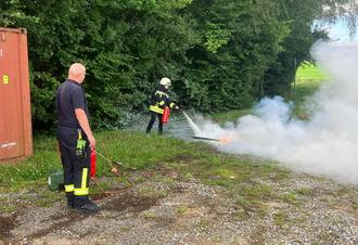Im Rahmen der regulären Übung der Tageseinsatzgruppe stand dieses Mal die theoretische Ausbildung und praktische Übung mit dem Feuerlöscher an. Hier konnten auch einige Mitarbeiterinnen und Mitarbeiter aus der Verwaltung teilnehmen.