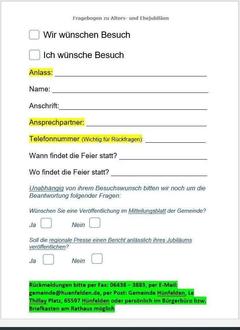 zur Gewährleistung und zum Schutz personenbezogenen Daten wird die Gemeinde Hünfelden künftig die wöchentlichen Auskünfte zu Ehe- und Altersjubiläen (ab dem 80sten Geburtstag alle 5 Jahre oder 50.-, 60.-, 65.-,70.-Ehejubiläen) im Mitteilungsblatt komplett einstellen. Sollte dennoch eine Veröffentlichung und /oder eine Gratulation durch Vertreter der Gemeinde Hünfelden gewünscht sein, kann dies durch Abgabe des ebenfalls im MTB veröffentlichten Fragenbogens - fünf Wochen vor dem Jubiläumsdatum - bei der Gemeindeverwaltung, im Bürgerbüro entsprechend vorgemerkt werden. Ohne persönliche Einwilligung können keine personenbezogenen Daten mehr veröffentlicht werden!