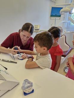 Die Kinder durften dann selbst die Sauger ausprobieren und an einem Modell sogar mit dem kleinen Bohrer Löcher in die Zähne bohren. Anschließend zeigte uns eine Mitarbeiterin wie man die Löcher wieder füllt und repariert.