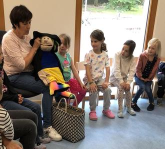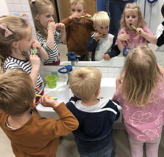 Eine Woche später erwarteten wir Frau Dr. Hinrichs in der „Villa Kunterbunt“. Sie besuchte uns mit 2 Mitarbeiterinnen und der Hexe Irma! Die Kinder lernten wie man die Zähne richtig pflegt und machten das auch ganz praktisch. Alle bekamen eine neue Zahnbürste und einen tollen Aufkleber von der Hexe Irma. Natürlich wurde auch unser Zahnputzlied gesungen!