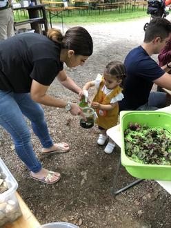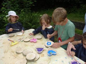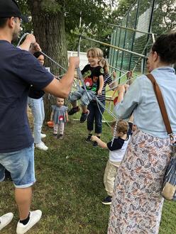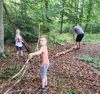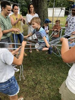 Es wurden Baumscheiben bemalt, die ein großes Kunstwerk bilden, Wettrennen im Dreibeinlauf und mit Sulkies fanden statt, jede Familie gestaltete ein kleines Biotop im Glas, es entstand ein Tipi mit Waldsofa, Baumgesichter wurden angefertigt und im Spinnennetz konnte jeder großen Mut und Vertrauen zu den Helfern beweisen.