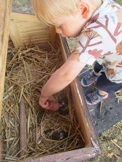 Mit allen Kinder wurden die Regeln und Abläufe besprochen, so dass alle auf den Montag sehr gespannt waren. Schnell lernten die Kinder den Umgang mit den Hühnern. Dazu gehörte die tägliche Versorgung mit Futter und Wasser, allerdings auch das Ausmisten des Stalls. Jeden Morgen gingen die Kinder mit freudiger Erwartung zum Hühnerhaus, um nach Eiern zu schauen. Die Hühner legten sehr zuverlässig täglich jeweils ein Ei. Aus den Eiern wurden dann in der Kita für alle Kinder ein Eierfrühstück zubereitet, Kuchen und Waffeln mit den geernteten Zucchini aus den Hochbeeten gebacken.