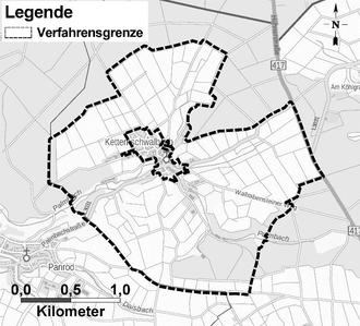 Die Abgrenzung des geplanten Verfahrensgebietes ist in der anliegenden Karte ersichtlich. Das geplante Verfahrensgebiet hat eine Größe von ca. 385 ha und umfasst weite Teile der Gemarkung Ketternschwalbach (Flur 18, 20 - 21, 23 - 28 komplett, sowie Flur 16, 17, 19, 22, 29 teilweise) und ein Flurstück in der Gemarkung Limbach (Flur 28).