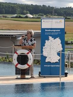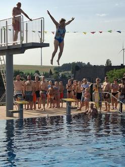 Bürgermeisterin Silvia Scheu-Menzer springt vom 3-Meter-Turm