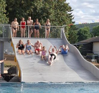 Nach der Eröffnungsrede lies es sich die Bürgermeisterin nicht nehmen, das Schwimmbad, über die neue Rutsche, offiziell zu eröffnen. Gemeinsam mit Friedhelm Leber (Mitglied Gemeindevorstand), Ulla Nattermann (Mitarbeiterin Verwaltung), Herr Schütze (Architekt) und Herr Gansloser (TGA Planer) rutschte sie ins kühle Nass. Im Anschluss weihte sie auch noch das 3 Meter-Sprungbrett ein.