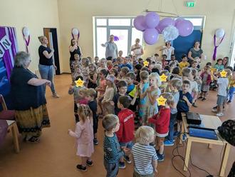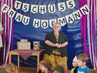 Die Kinder wurden im Vorfeld dazu befragt und es entstanden lustige und kluge Aussagen, die in dem Film präsentiert wurden. Weiter ging es mit dem Überreichen vieler unterschiedlicher Dinge, die besondere Eigenschaften von Frau Hofmann symbolisierten. Nach dieser schönen aber auch emotionalen Feierlichkeit wünschen wir Frau Jutta Hofmann alles Liebe und Gute.