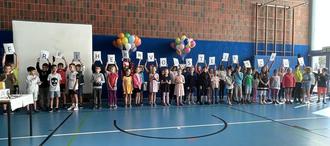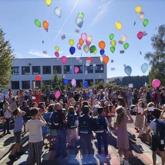 Zum Abschluss dieses aufregenden Tages trafen sich die frisch eingeschulten Kinder mit ihren Angehörigen, Lehrerinnen und Lehrern sowie der Schulleitung auf dem Pausenhof der Grundschule wieder, um ihre bunten Luftballons gemeinsam auf die Reise zu schicken.
