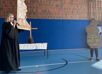 Zu Beginn fand der freiwillige ökumenische Gottesdienst rund um die Hummel Bommel statt, der von unserer Schulseelsorgerin Christiane Tabor-Stambke, Pastoralreferentin Hanna Schäfer von der Pfarrei Heilig-Geist Goldener Grund/Lahn und der Pfarrerin der evangelischen Kirchengemeinde Kirberg-Ohren, Tanja Konter, gestaltet wurde.
