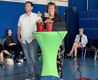 Claudia Schmitt stellte als Vorsitzende des Fördervereins die wichtige Arbeit des Vereins vor, der neben zahlreichen Pausenspielgeräten und Sitzgelegenheiten rund um das Schulgebäude auch den Wasserspender im Erdgeschoss finanziert sowie regelmäßig Preise für Wettbewerbe organisiert, und überreichte die ebenfalls vom Förderverein gestifteten Postmappen für die Kinder. Andreas Harffert, Schulelternbeiratsvorsitzende lud alle Eltern zur aktiven Mitarbeit ein und ließ einige gelungene Schulveranstaltungen, wie z.B. das Frühlingsfest im Mai Revue passieren.