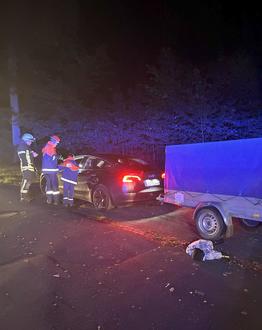 Beim Versuch die Umgebung zu verlassen wurde eine Person unter einem Hänger eingeklemmt und befindet sich in unmittelbarer Nähe zum Brandobjekt