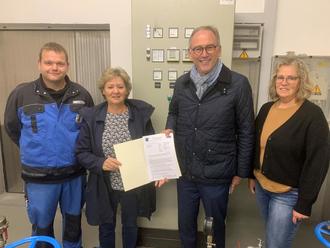 Übergabe des Förderbescheides (von links): Wassermeister Christopher Neeb, die Hünfeldener Bürgermeisterin Silvia Scheu-Menzer, Landrat Michael Köberle und Ulla Nattermann aus dem Bauamt.