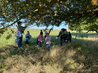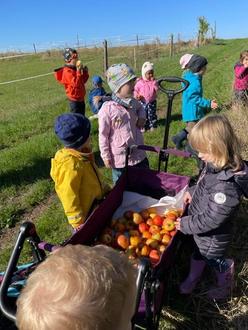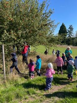 Nach dem Frühstück in unserer Einrichtung sind wir an einem sonnigen Tag, unserem Wandertag, mit Bollerwagen zum großen Apfelbaum gewandert. Unterwegs begrüßten wir die Hühner und lernten neue Blumen, wie die Wegwarte, kennen. Und dann, schon von weitem konnte man den großen Apfelbaum sehen, der voll mit wunderschönen rotgelben Äpfeln war. Die Äste hingen bis ganz nach unten! Keiner konnte widerstehen und musste einen oder zwei Äpfel probieren. Nach der Stärkung waren alle Kinder fleißig, um genügend Äpfel für Apfelmus und Apfelkuchen im Kindergarten zu sammeln.