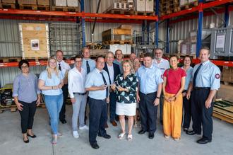 Rund 85.000 € hat die Einrichtung aktuell gekostet. Ganz besonders bedankte sich Bürgermeisterin Scheu-Menzer beim Landkreis Limburg-Weilburg für die finanzielle Unterstützung der Maßnahme durch das Förderprogramm Zukunftsfonds „Stark und Innovativ“ - Säule B in Höhe von rund 43.600 Euro. Die Schlüsselübergabe an den Leiter des Katastrophenschutzzuges der Gemeinde Hünfelden, Stefan Preußer, erfolgte unter großer Anteilnahme der gemeindlichen Gremien, kommunalen Verwaltung und Vertreter/innen der politischen Gremien. Mit dabei waren in Vertretung des Landrats der 1. Kreisbeigeordnete Jörg Sauer, Gemeindebrandinspektor Mario Bauer mit seinen beiden Stellvertretern Thorsten Müller und Daniel Wagner, die ehemalige Ordnungsamtleiterin Helga Natz, die seinerzeit die ersten Schritte mit begleitet hat, die neue Ordnungsamtleiterin Annika Jäger sowie Nicole Schulz aus der Verwaltung. Sie haben dazu beigetragen, dass die Gemeinde Hünfelden nun ein hochwertig ausgestattetes Katastrophenschutzlager zur Verfügung gestellt bekommen hat, wenngleich die Schlüsselübergabe mit der Hoffnung verbunden ist, dass man von größeren Schadenereignissen verschont bleibe, so Silvia Scheu-Menzer, und, dass die Einsatzkräfte stets wohlbehalten und gesund zu ihren Familien zurückkehren.
