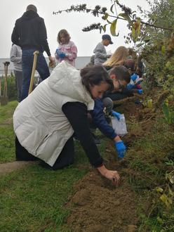 So hilft das neue Blumenbeet im nächsten Frühjahr mit bunten Blumen, einer vielfältigen Mischung aus Krokussen, Tulpen, Narzissen und Hyazinthen, den Bienen eine erste Nahrung zu finden und es wird alle, die die Schule betreten, mit den bunten Blüten erfreuen.