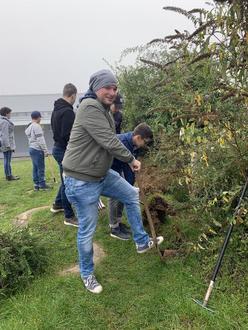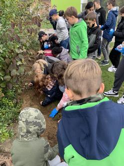 Dazu lockerten die Schüler und Schülerinnen den Boden, bis die nötige Pflanztiefe erreicht war. Dann wurden die verschiedenen Zwiebeln gemeinsam in die Erde gesteckt, die anschließend wieder verteilt wurde, sodass alle Zwiebeln bedeckt waren.