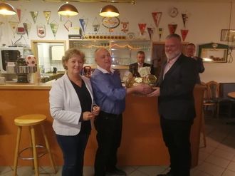 Um diese Auszeichnung entsprechend zu feiern, stießen die Anwesenden mit einem Glas Sekt an, bevor Silvia Uwe die Ehrennadel ansteckte und ihm die Urkunde verlieh. Axel Hankammer überreichte ihm noch einen Präsentkorb gefüllt mit allerlei Neesbacher Köstlichkeiten.