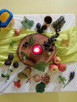 nd ein Holzbrettchen mit geerntetem Obst und Gemüse. Wir sprachen darüber, dass wir Gott für unsere Ernte „Danke“ sagen und hatten