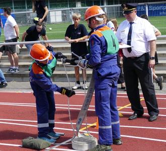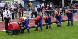 Teil B, der Staffellauf, prüft Schnelligkeit, Koordination und Präzision, denn mehrere Stationen mit feuerwehrtechnischen Aufgaben müssen nacheinander in Höchstgeschwindigkeit absolviert werden.
