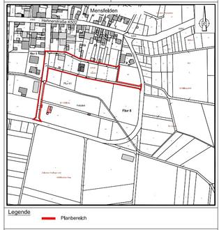 1. Plangebietsabgrenzung für den Bebauungsplan „Lange Gärten“ Ortsteil Mensfelden (ohne Maßstab).